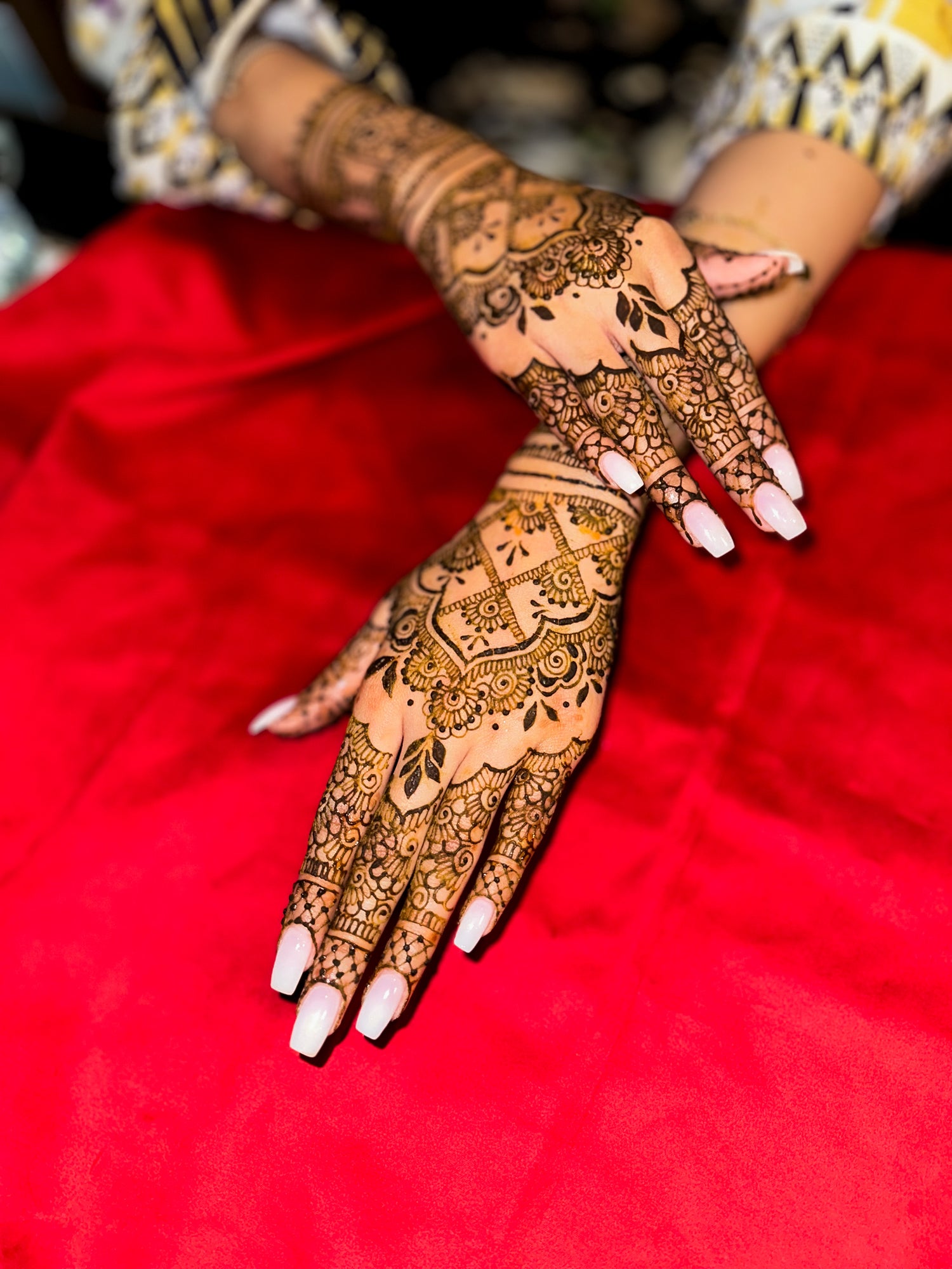 Elevate your bridal experience with personalized, bespoke bridal henna art. Every detail, from design elements to your preferences, is meticulously discussed prior to the service, ensuring a truly unique and tailored bridal henna. All packages below include a complimentary consultation to discuss your vision, followed by a digital henna design sample preview for your input. This ensures that your bridal henna is uniquely yours, setting the stage for a seamless experience for your special day.