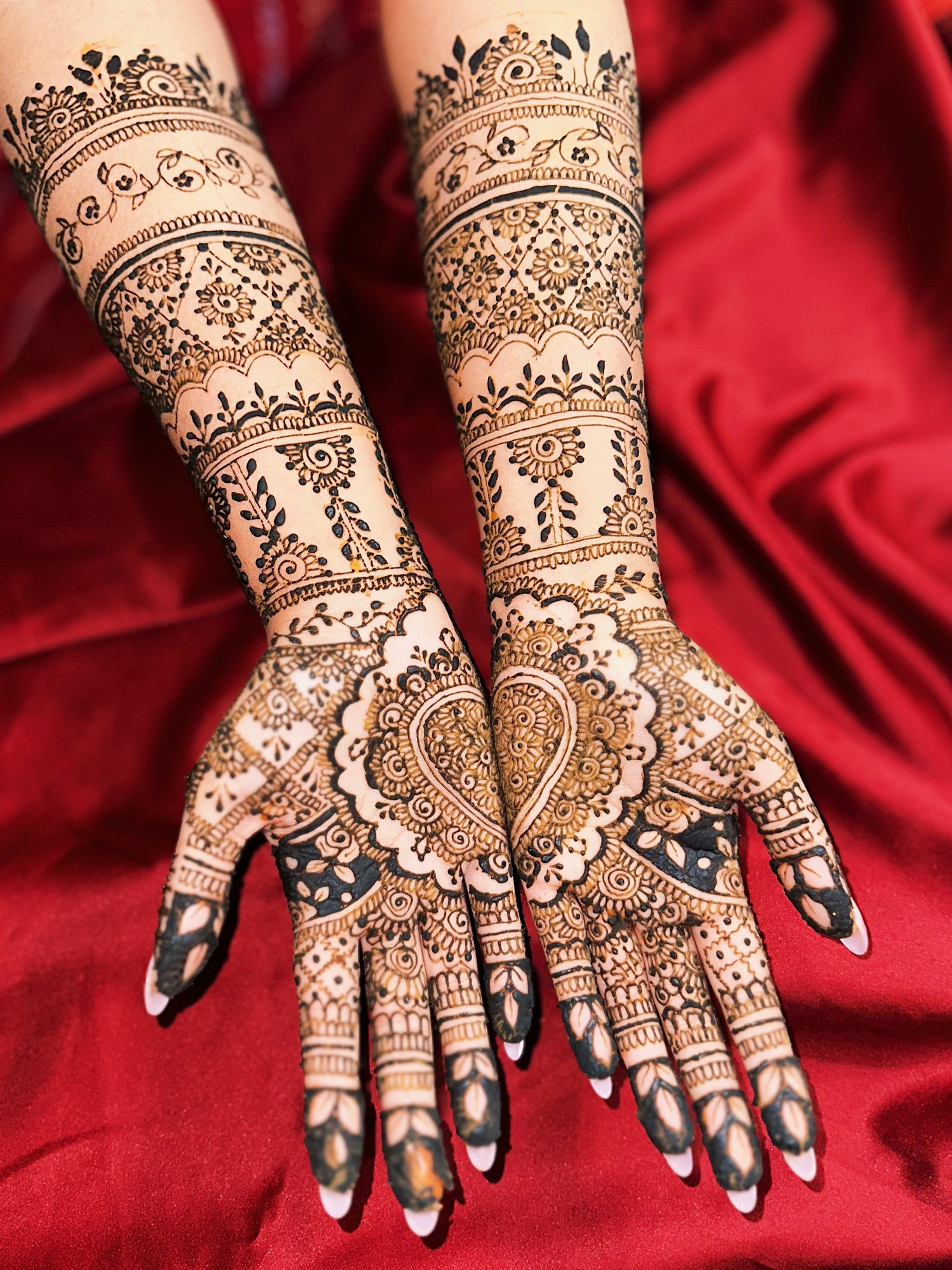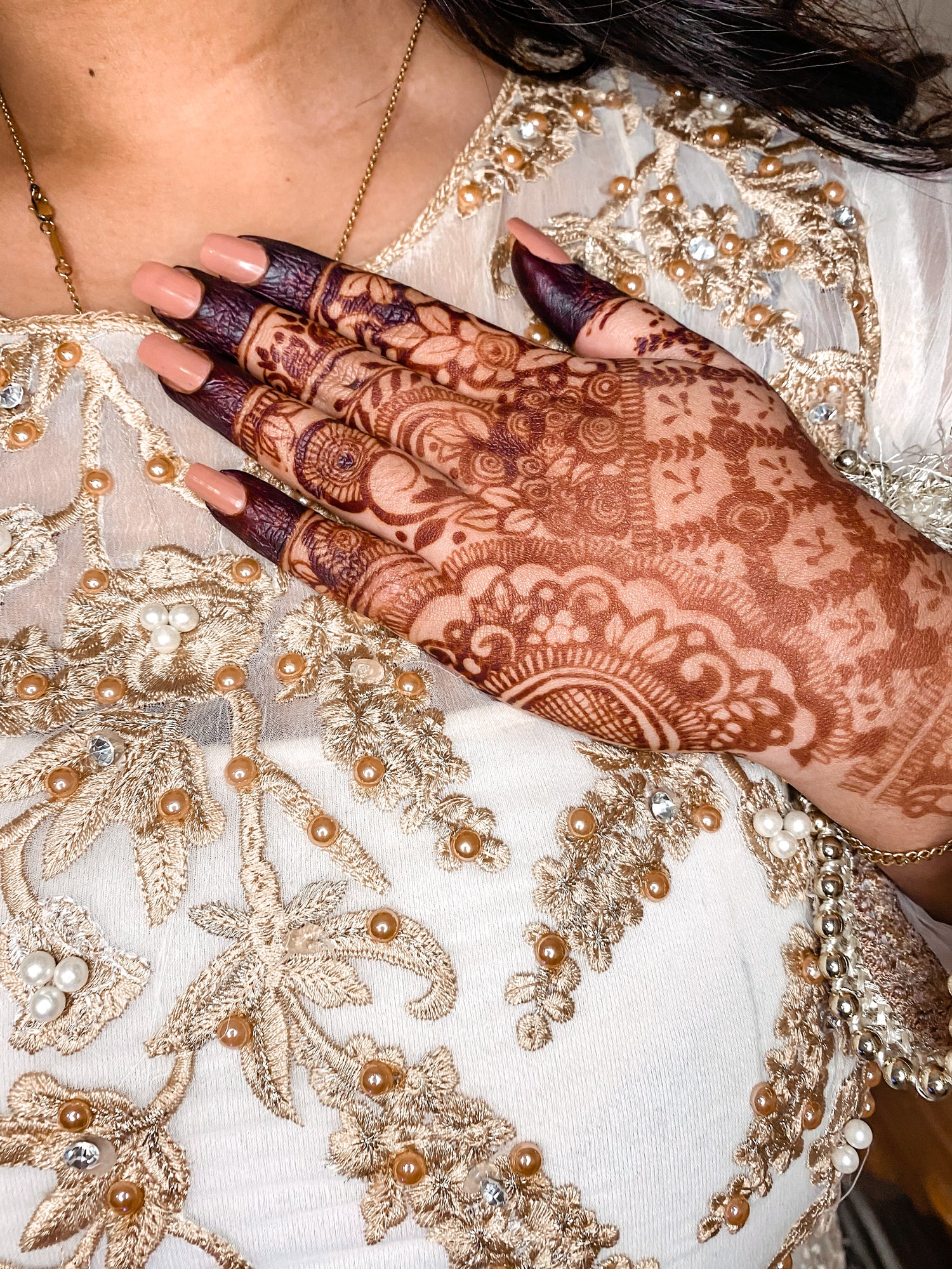 Elevate your bridal experience with personalized, bespoke bridal henna art. Every detail, from design elements to your preferences, is meticulously discussed prior to the service, ensuring a truly unique and tailored bridal henna. All packages below include a complimentary consultation to discuss your vision, followed by a digital henna design sample preview for your input. This ensures that your bridal henna is uniquely yours, setting the stage for a seamless experience for your special day.